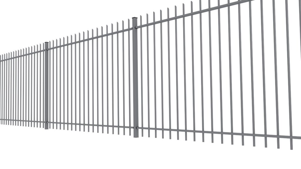 The bar fencing is constructed from bar panels that are blind-mounted to the posts, ensuring a seamless and secure connection.