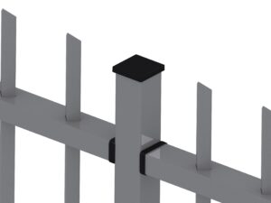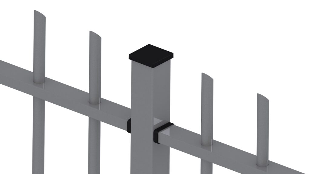 The bar fencing is constructed from bar panels that are blind-mounted to the posts, ensuring a seamless and secure connection.